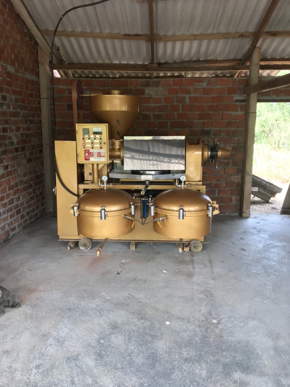 Bình thường khi ép dầu phụng (dầu lạc, dầu đậu phộng) dầu sẽ chảy ra một khay riêng và bã ra theo một đường khác. Nhưng khi máy bị hỏng, dầu chảy ra kèm theo rất nhiều bột bã, không thể thu dầu lạc được. Đương nhiên như vậy bắt buộc phải dừng máy để khắc phục sự cố.